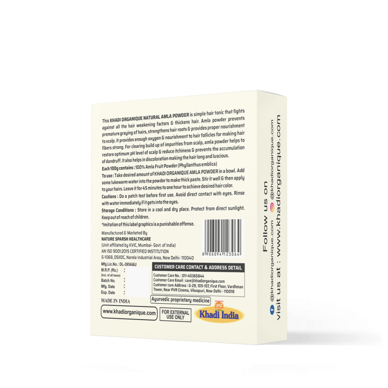 This KHADI ORGANIQUE NATURAL AMLA POWDER is simple hair tonic that fights against all the hair weakening factors & thickens hair. Amla powder prevents premature graying of hairs, strengthens hair roots & provides proper nourishment to scalp. It provides enough oxygen & nourishment to hair follicles for making hair fibers strong. For clearing buildup of impurities from scalp, amla powder helps to restore optimum pH level of scalp & reduce itchiness & prevents the accumulation of dandruff. It also helps in discoloration making the hair long and luscious.